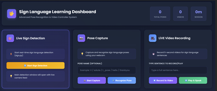 The system interface includes useful features such as live sign detection, pose capture, video recording, playback, and system controls. These modules make the platform easy to use for both technical and non-technical users. Overall, this project combines machine learning, computer vision, gesture tracking, and web technologies into one complete platform that supports real-time communication, accessibility improvement, and sign language learning support.