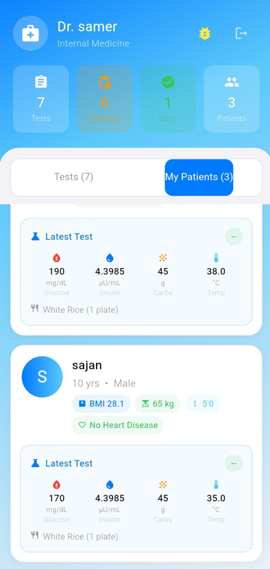The system is developed as a role-based application with three main users: Admin, Guardian, and Doctor. Guardians can register, add child profiles, enter health values, record meal details, and perform sugar-related tests through a simple mobile interface. Doctors can review prediction results and provide professional medical recommendations, while the admin manages doctor approvals, monitors system activity, and controls overall records. This structured workflow improves safety, organization, and role-based access in the application.