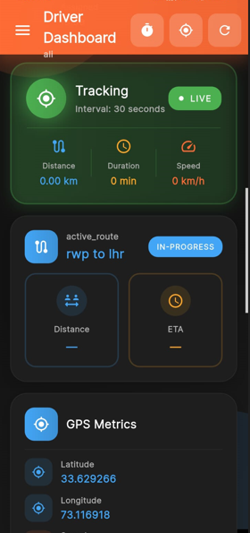 This project consists of two main user interfaces: a mobile application for drivers and a web dashboard for administrators. The driver mobile app allows drivers to log in, view assigned routes, receive alerts, update trip progress, and report issues during travel. The admin dashboard allows fleet managers to monitor vehicle movement, assign routes, check alerts, manage records, and generate reports. A Python-based backend handles system logic and communicates with Firebase, which stores real-time and historical data for both the mobile app and the web platform.